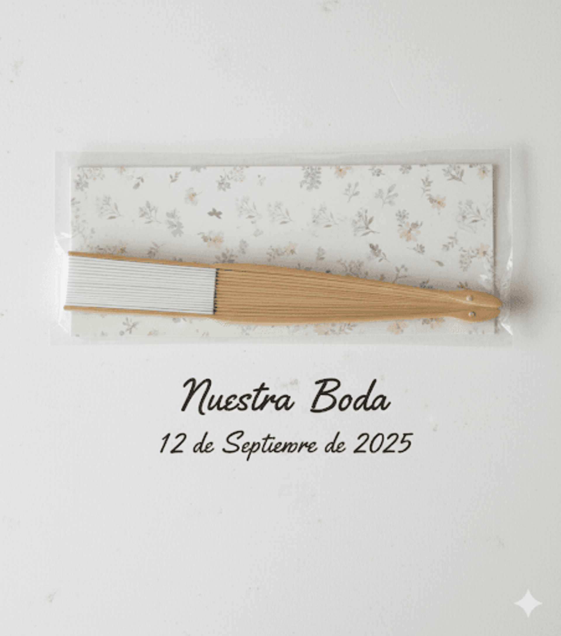 Abanico madera natural y tela blanca 23cm. Min.6 3,60€