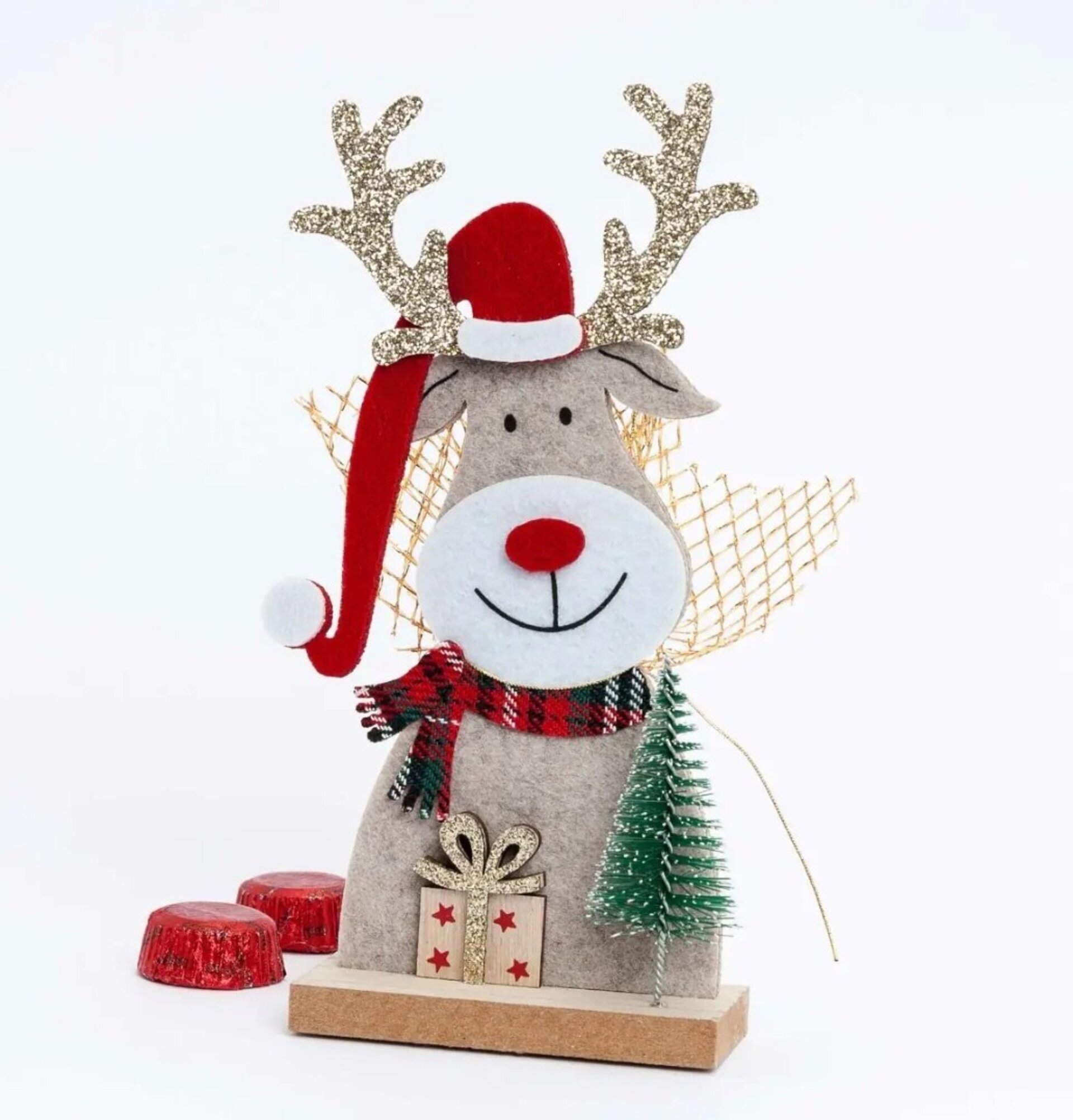 Reno fieltro base de madera árbol, regalo y 2 bombones