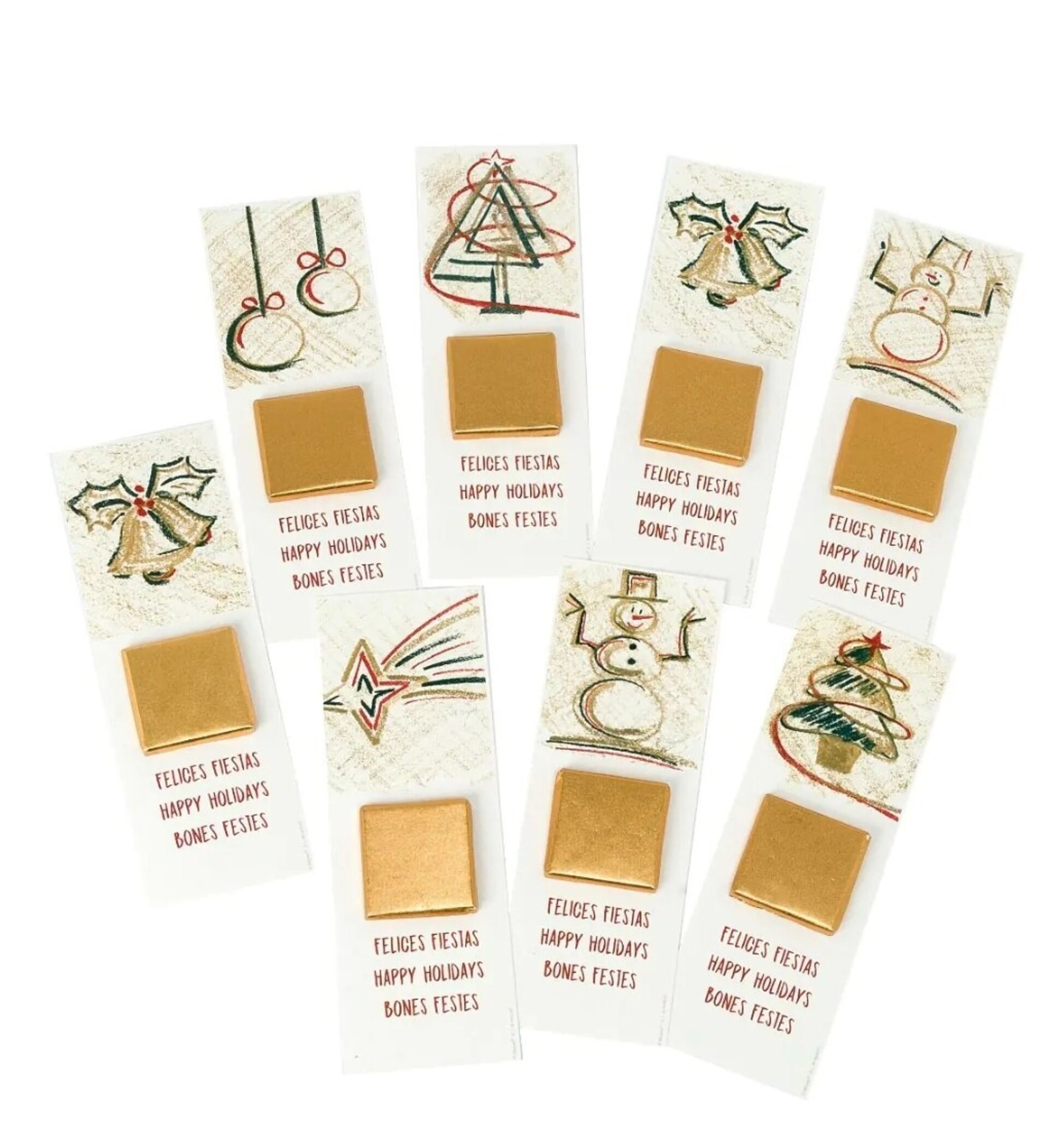 Punto libro 1 € ud , min 8. Trazos Felices Fiestas 3 idiomas 1 chococolate
